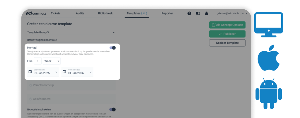 Efficiënt auditbeheer is cruciaal voor projectmanagers, en met de nieuwe herhalende audits functie van Ed Controls wordt dit proces een stuk eenvoudiger. Je kunt nu audits automatisch laten herhalen op een vast schema, zodat je je kunt richten op andere belangrijke taken terwijl het systeem de routinematige audits afhandelt.