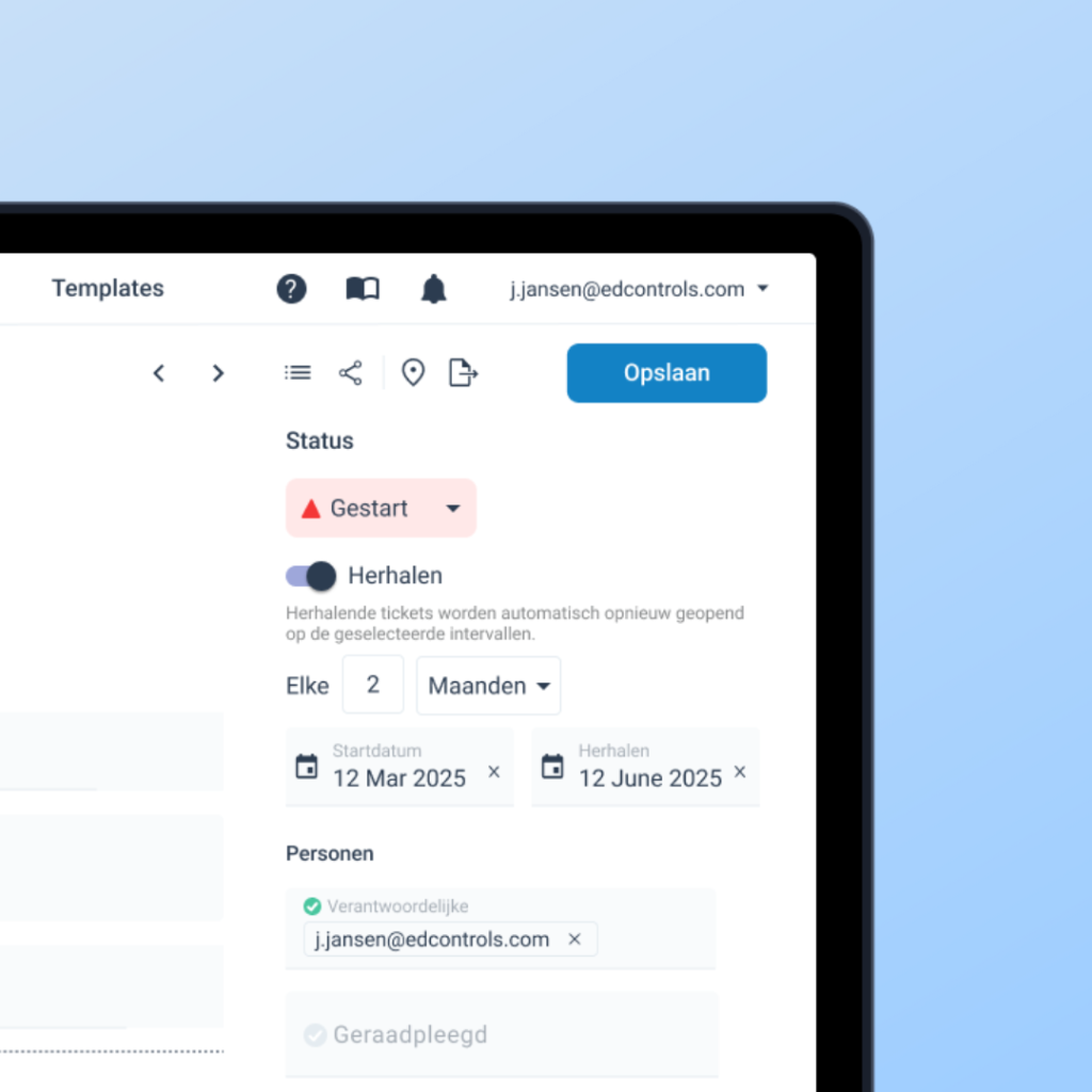 Sommige taken komen steeds terug, zoals maandelijkse inspecties of wekelijkse controles. Met herhalende tickets in Ed Controls hoef je daar niet meer zelf aan te denken. Het systeem opent deze tickets automatisch op het juiste moment. Zo blijft alles netjes op schema en bespaar je tijd. Deze functionaliteit is beschikbaar in de Expert licentie.