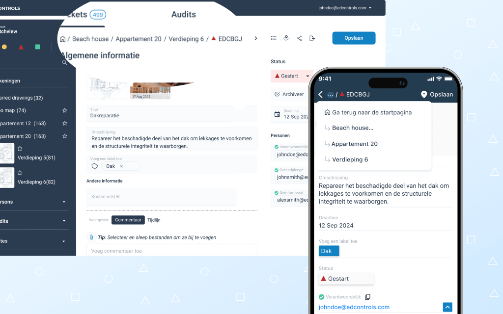 Om dit op te lossen, hebben we een duidelijk pad weergegeven bovenaan het detailscherm in de ticket-, audit- en bibliotheekmodule. Dit pad toont je huidige locatie binnen de projecthiërarchie—project, tekengroep, tekening en het specifieke ticket of de audit. Het ticket-ID en de status zijn ook duidelijk zichtbaar voor snelle referentie.