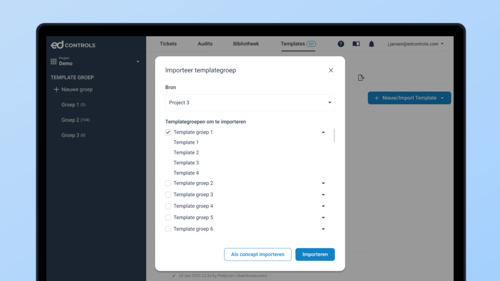 Kies je voor ‘Importeer template groep’, dan selecteer je eenvoudig een project via een dropdown. Vervolgens zie je automatisch welke groepen daarbij horen, netjes gegroepeerd en overzichtelijk weergegeven in een scrollbaar venster. Je kunt meerdere groepen tegelijk selecteren en met één klik importeren.