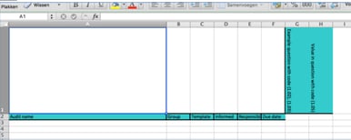 Wanneer je het gedownloade Excel-document opent, zie je dat de vragen van de audit in de eerste rij staan. De audits die je gaat klaar zetten komen in de rijen eronder.
