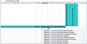 Als je met je cursor op de cel in de kolom van template klikt (kolom C), dan zie je dat er een pull down menu verschijnt. Zie afbeelding hieronder: