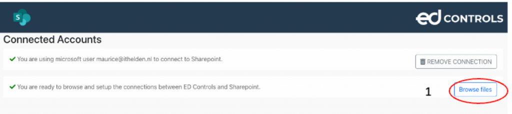 Om bestanden vanuit SharePoint naar Ed Controls te krijgen moeten de metadata-kolommen in SharePoint "verbonden" worden met de Groepen in Ed Controls, klik op “Browse files” om bestanden (1) om deze verbinding tot stand te brengen.